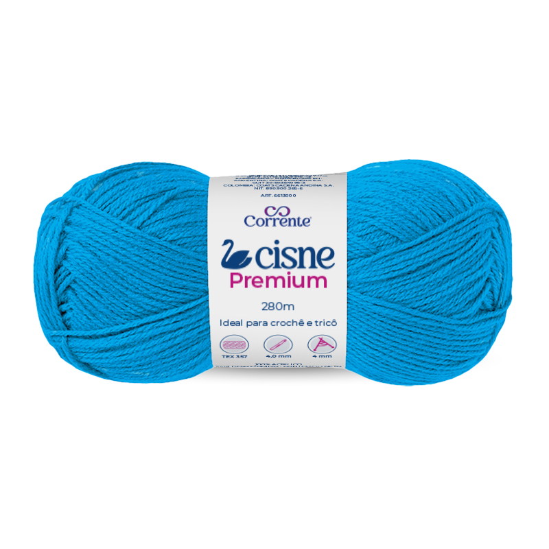 O produto apresentado é um fio de crochê e tricô da marca Corrente, modelo Cisne Premium, na cor azul vibrante. Possui um comprimento de 280 metros e é indicado para trabalhos manuais como crochê e tricô. A embalagem destaca que o fio é ideal para essas técnicas, com especificações técnicas como TEC 357, diâmetro de 4,0 mm e peso de 4 mm. O fio é apresentado em uma bobina compacta, com a marca ‘Corrente’ e o nome ‘Cisne Premium’ claramente visíveis na etiqueta central. A cor azul intensa do fio sugere que ele é adequado para projetos que exigem cores vivas e vibrantes, sendo uma escolha popular para iniciantes e profissionais que buscam qualidade em materiais para artesanato.