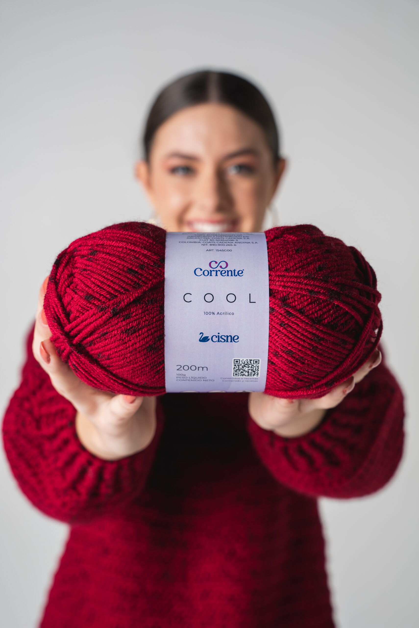 O produto apresentado é um fio de acrílico da marca Corrente, modelo Cool, em tom vermelho escuro com pequenos detalhes pretos. Possui especificações técnicas de 100g de peso líquido e 200 metros de comprimento, sendo 100% acrílico. A embalagem inclui o logotipo da marca, o nome do modelo e informações sobre a composição. A pessoa na imagem segura o fio com as mãos, destacando seu tamanho e textura. O fio é ideal para trabalhos manuais como tricô e crochê, oferecendo versatilidade e durabilidade. A cor vermelha intensa com detalhes pretos confere um visual elegante e moderno, adequado para projetos de roupas ou acessórios.