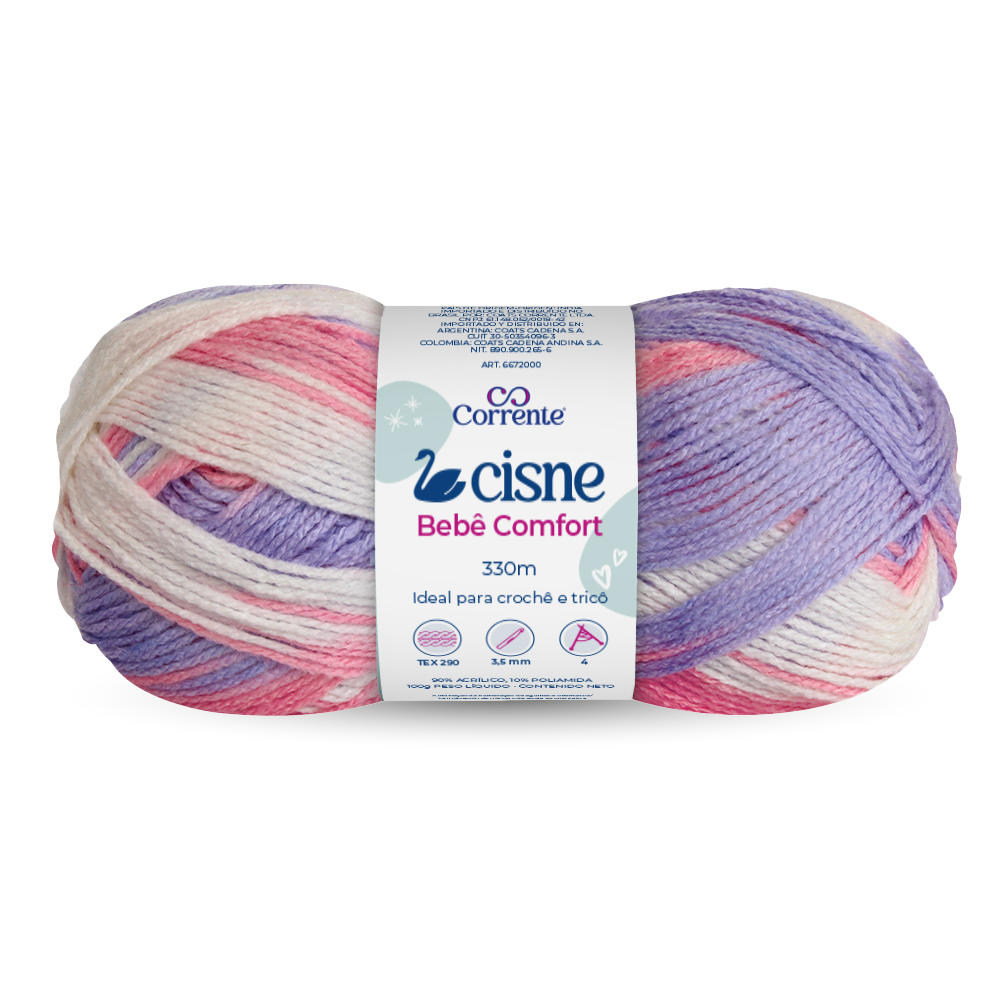 O produto é um fio de crochê e tricô da marca Corrente, modelo Cisne Bebê Comfort, indicado para trabalhos com bebês. Possui 330 metros de extensão e 100g de peso, sendo 100% acrílico e 10% poliamida, o que garante maciez e durabilidade. As cores são suaves, com tons de rosa, lilás e branco, perfeitas para criações delicadas. A embalagem destaca que é ideal para crochê e tricô, com informações técnicas como TEK 250 e 3,5 mm, além de um símbolo de cuidado com a pele sensível. O fio é apresentado em uma bola compacta, com a etiqueta central mostrando detalhes da marca e especificações do produto.