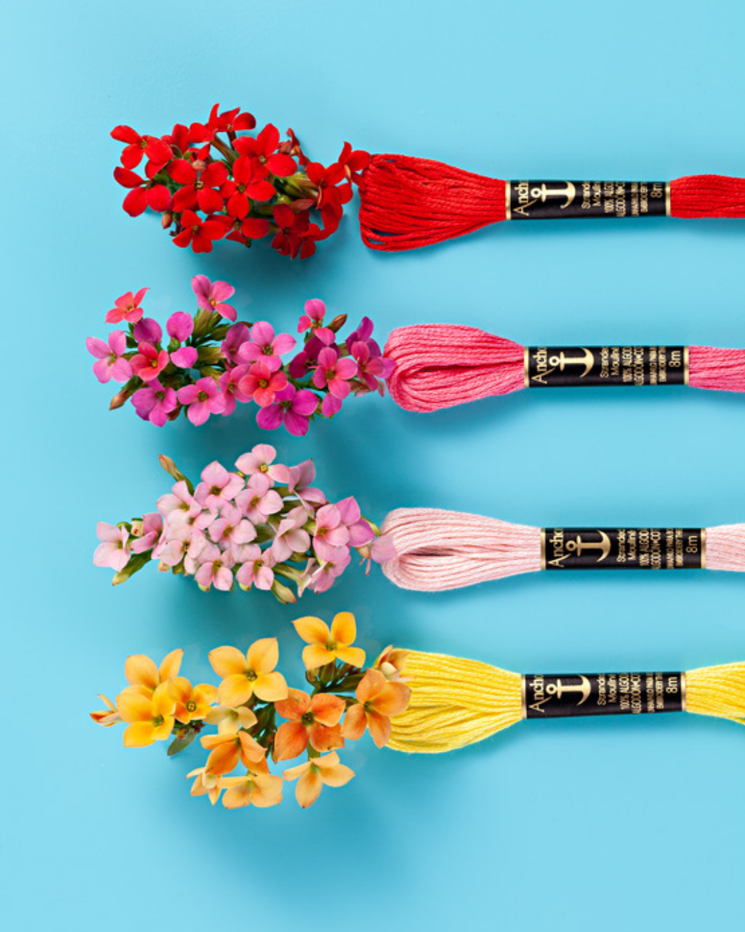 O produto apresenta quatro fios de costura da marca Anchor, dispostos em uma fileira horizontal sobre um fundo azul claro. Cada fio é acompanhado por um buquê de flores que reproduzem exatamente a cor do fio: vermelho, rosa, rosa claro e amarelo. Os fios são de alta qualidade, com 8 metros de comprimento, e possuem a etiqueta preta com o logotipo da marca. As flores, que parecem ser de uma planta ornamental, são dispostas de forma a complementar visualmente o fio correspondente, criando uma composição harmoniosa e atraente. Este conjunto é ideal para projetos de costura artística ou decoração, onde a combinação de cores e a estética visual são importantes.